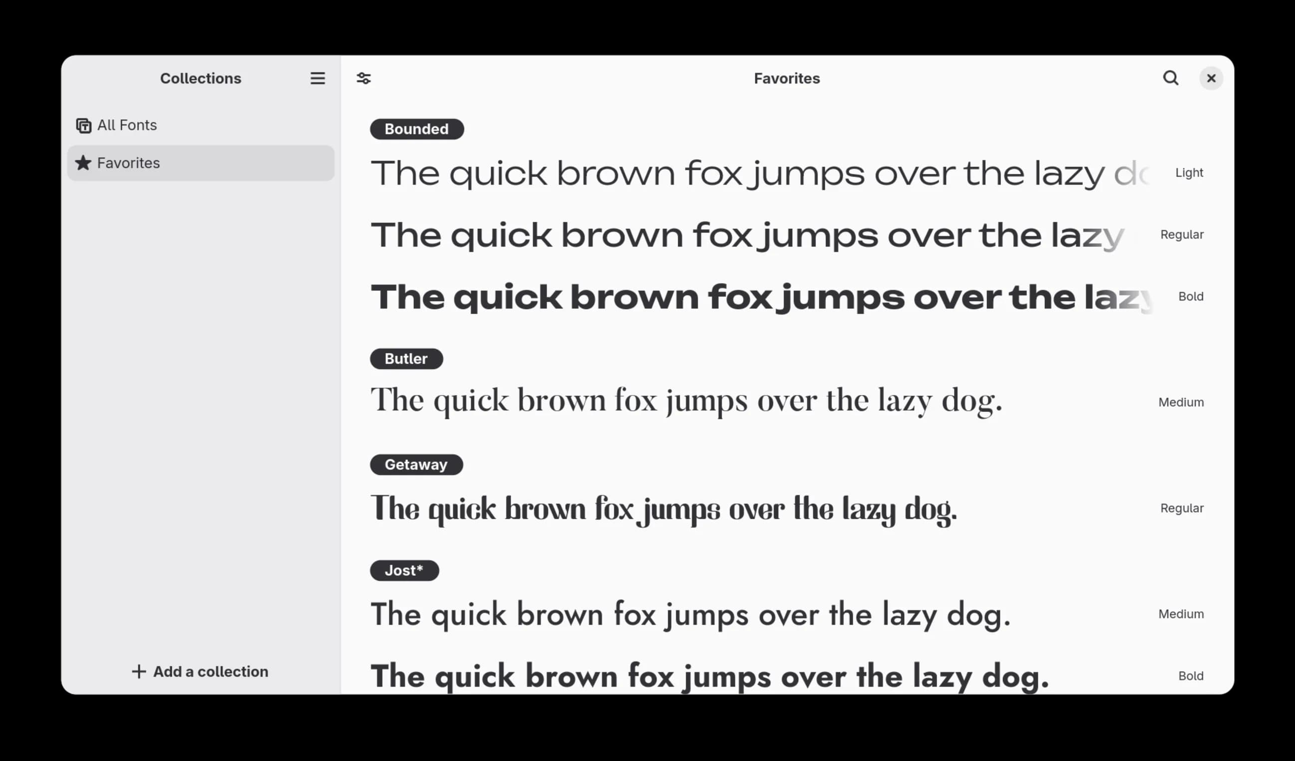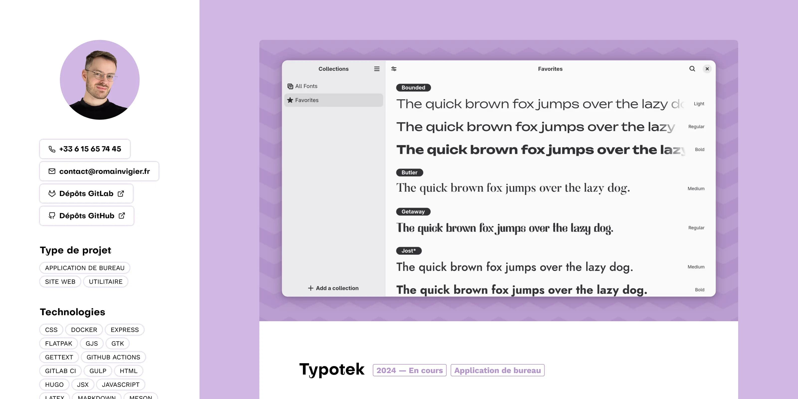 Visionneuse des fontes installées sur le système, avec la possibilité de personnaliser le texte d’aperçu et de créer des collections. L’interface s’adapte à différentes tailles d’écran et est entièrement traduisible.