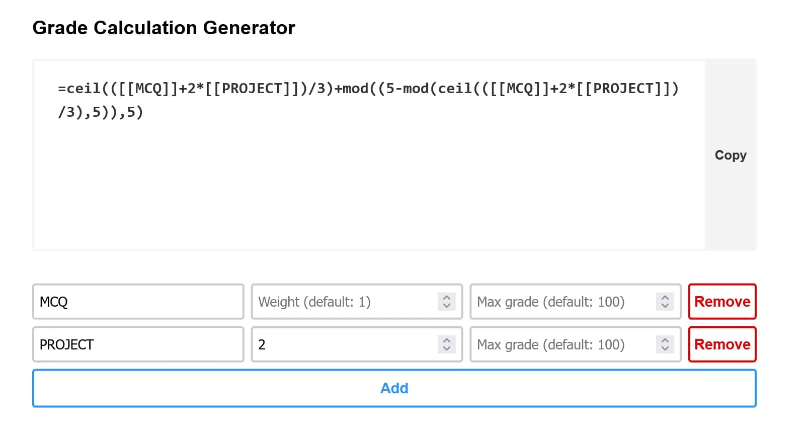 Page web permettant à l’équipe pédagogique d’une école de facilement générer une formule de calcul de note pour la plateforme Moodle selon les paramètres désirés. C’est une page HTML avec du CSS et du JavaScript vanilla afin qu’elle puisse être facilement ouverte et utilisée sur tous les postes.