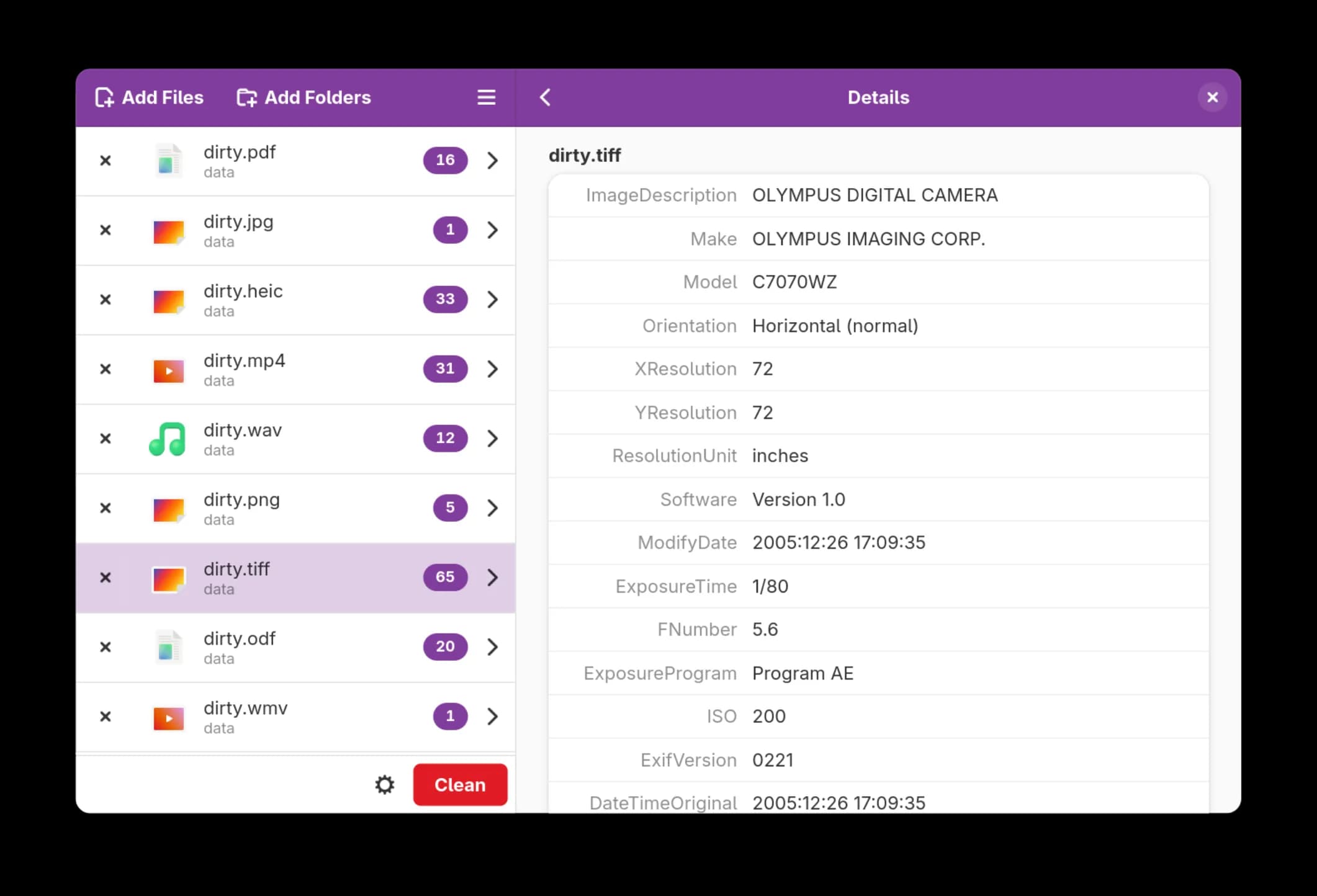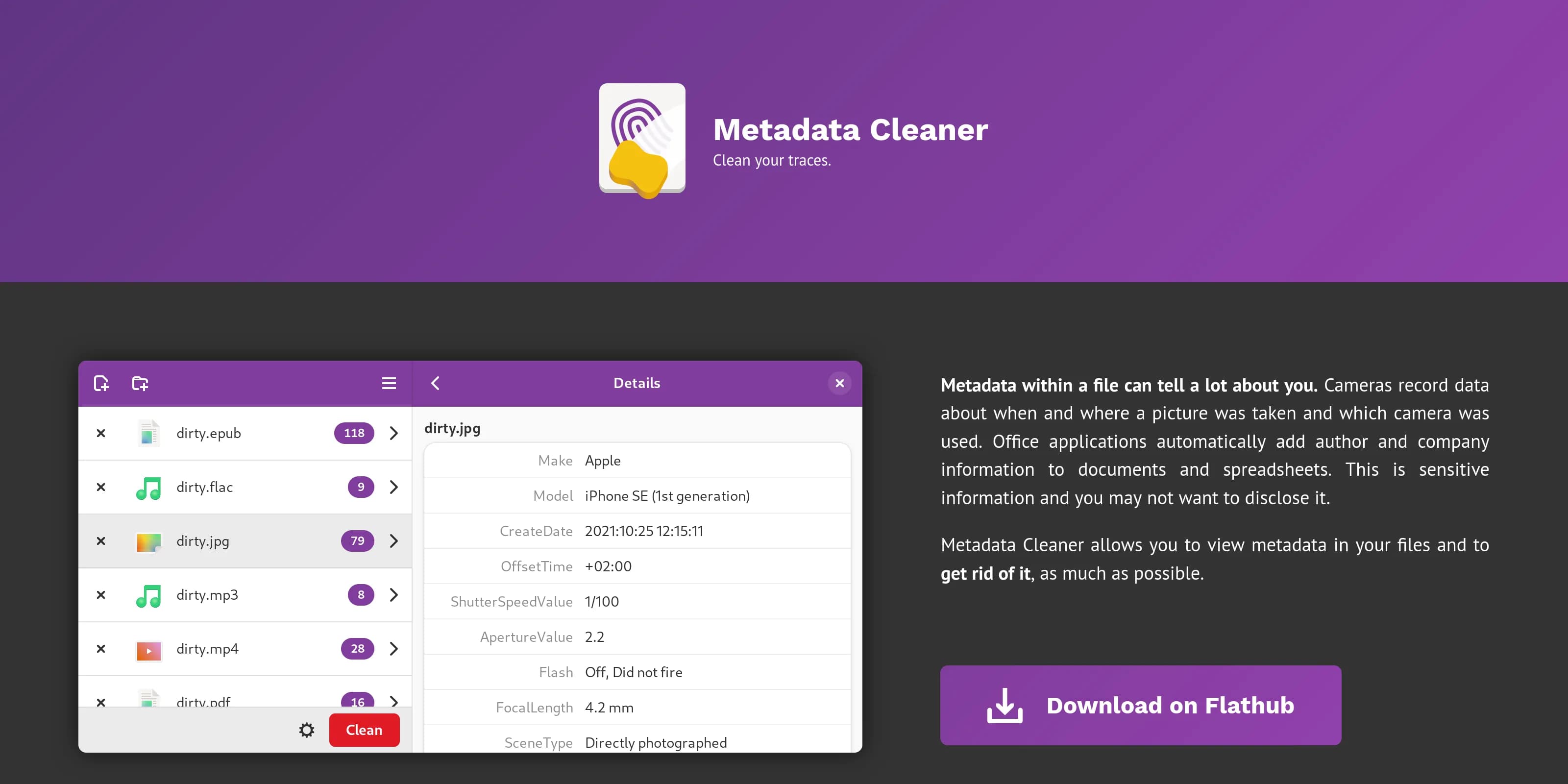 Logiciel permettant d’afficher et de nettoyer les métadonnées de nombreux types de fichiers. L’interface s’adapte à différentes tailles d’écran et est entièrement traduisible.