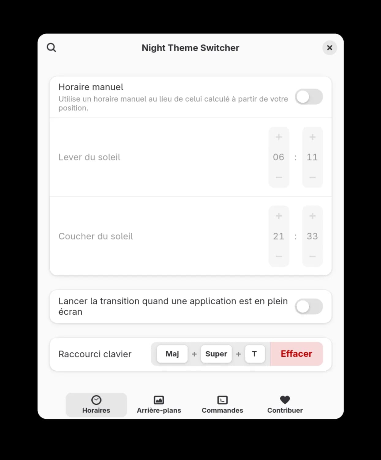 Extension pour l’environnement de bureau GNOME qui bascule automatiquement entre les thèmes clairs et sombres selon le moment de la journée. L’interface est entièrement traduisible.