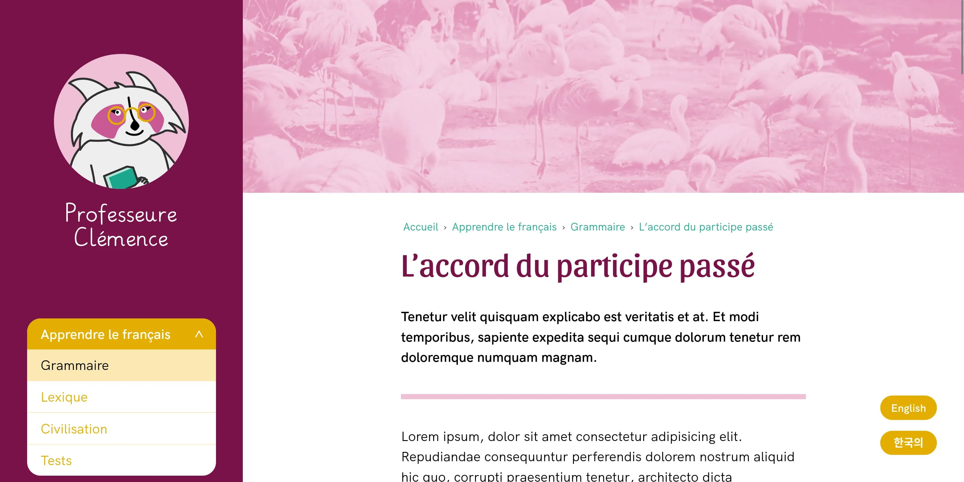 Site WordPress permettant à une professeure de français de publier des cours, avec un support multilingue. Le thème a été créé et intégré de zéro.