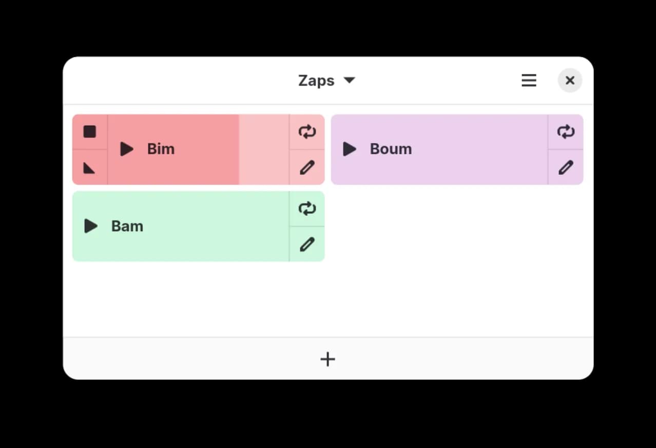 Logiciel de soundboard permettant de jouer des sons ajoutés par l’utilisateur·ice, avec la possibilité de créer différentes collections. L’interface s’adapte à différentes tailles d’écran et est entièrement traduisible.